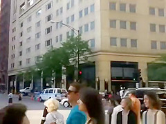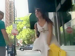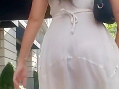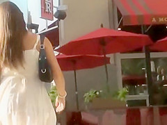 Brunette Hair gal in white suit walking
