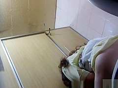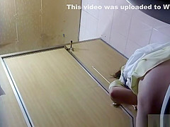 Description: Oriental lifts her petticoat and pulls down her nylons and panties to seat and take a pee in public WC.