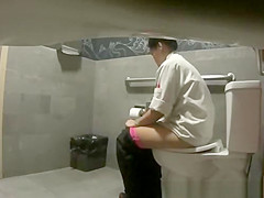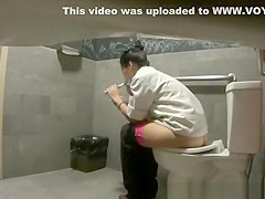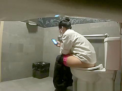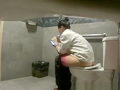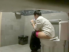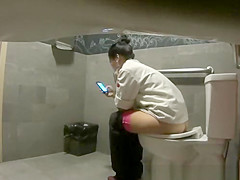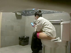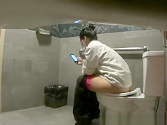Hidden camera in public biffy catches woman pissing and smokin' electronic cigar as that babe checks her smartphone.