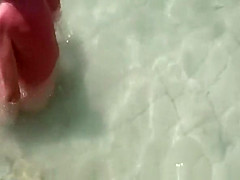 Lad laid down in rocky beach by the water has his wang stroked by her wife rolled in beach towel. They go for a refreshing swim in the water and come back to their towel where that babe keeps playing with his rod.
