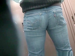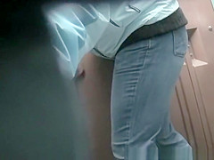 Babe spied in public portable crapper pulling down her jeans panties and her pants to pee.