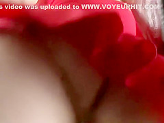 I'm calling this honey in red a bunny cuz I desire to bunny hump her until somebody would be brave sufficiently to separate us. Her unparalleled red suit is barely covering everything and this babe had petite yellow strap unfathomable in her a-hole crack when I checked out her upskirt. I loved that little taut gazoo.