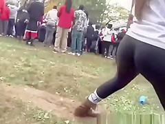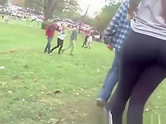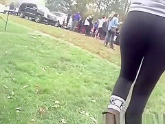 College legal age teenager with large a-hole in darksome leggings