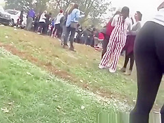 College legal age teenager with large a-hole in darksome leggings walking in the park.
