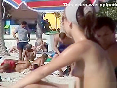 Cute angel with miniature bumpers and large teats enjoys the sun with her sun protected oiled constricted body at the beach.