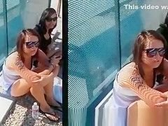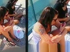 Legal Age Teenagers in short jeans sitting in the floor at the bus stop expecting for the bus to come. They had hot legs.