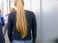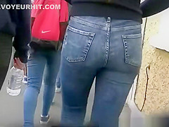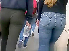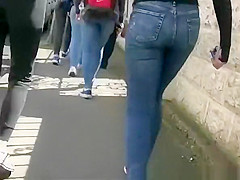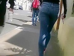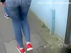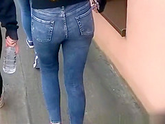 Description: Legal Age Teenager in taut jeans panties and darksome leggings walking in the sidewalk.