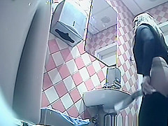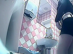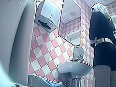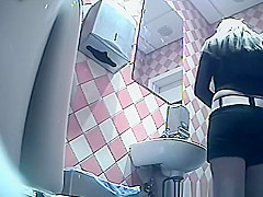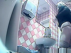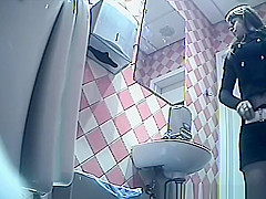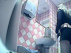 Gal in dark shorts and gray nylons pulls 'em down to take a pee in the throne-room. This Babe then pulls her strap up and looks at her figure in the mirror previous to pulling up the rest.