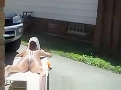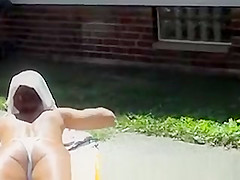 Pervert neighbour jerking whilst watching her sexy neighbour sunbathing topless. This Babe has a great tan and a great gazoo likewise.