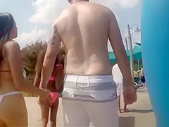 Dark Brown gal with lengthy hair and fine butt in bikini walking with her boyfriend.