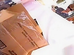 Woman in pink costume bows to grab smth from a card box on the floor and receives her butt and pants filmed.