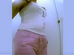 Plump woman spied in beach cabin undressing her dark bikini and dressing her white brassiere and pants and pink shorts and white top.