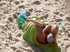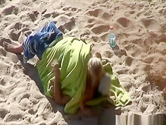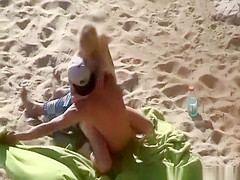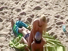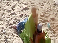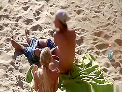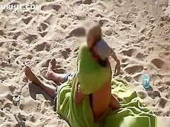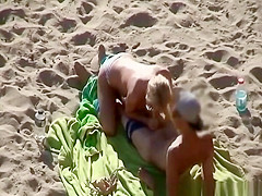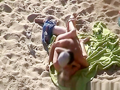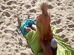 Golden-Haired gal sucks on her boyfriend's large penis at beach. After some penis engulfing that babe takes her bikini bottom and rides that large schlong.
