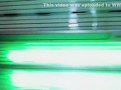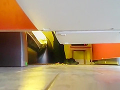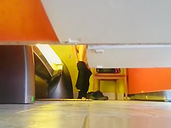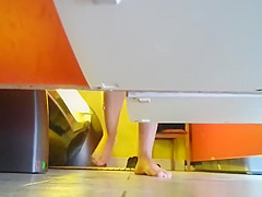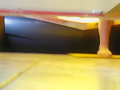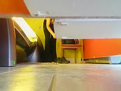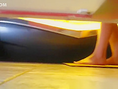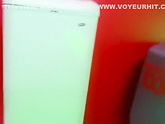Voyeur with spy camera films woman undressing in tanning room for a tanning session.