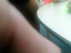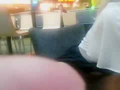 Exhibitionist woman in short darksome petticoat widens her legs during the time that siting at the cafe table and plays with it.