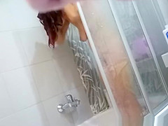 Description: Woman spied in the washroom shaving her legs in shower and drying her body.