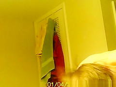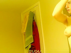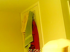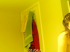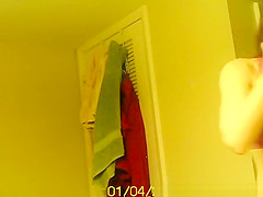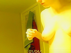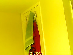 Description: Angel spied in baths putting roll on on her armpits and drying her hair with a hair drier.