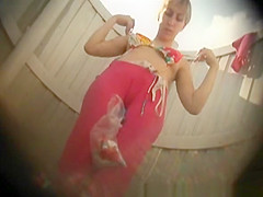 Taut body blond spied in beach cabin undressing her raiment and dressing her colorful bikini.