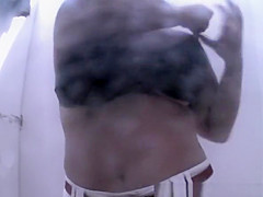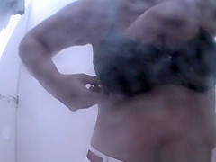 Overweight woman with large breasts and bushy vagina spied in beach cabin showering, drying and dressing.