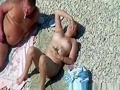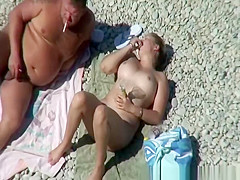 Nudist woman with shaggy cookie laid down in rocky beach eating smth.