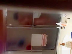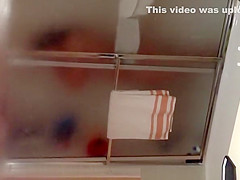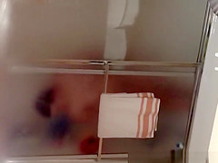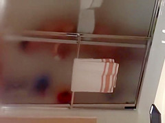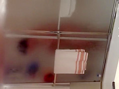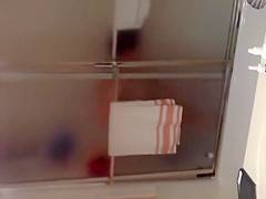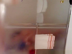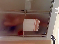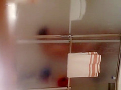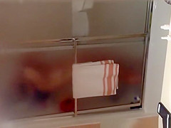 Woman taking a shower in shower cabin and stepson secretly filming her and jerking off his cock with her brassiere.