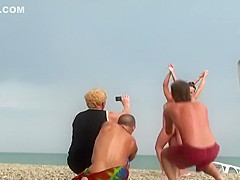 Naked beauties pose for a photo and a voyeur