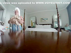 Overweight grandma with large billibongs and glasses caught by hidden camera wearing large grandma pants and brassiere.