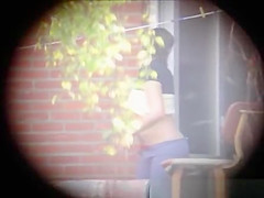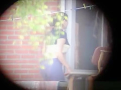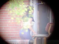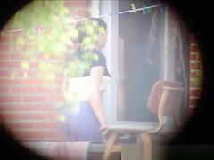 Description: My neighbour in hot outfit doing fitness exercises on her terrace