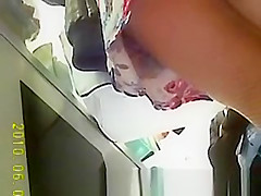 Description: Upskirt on woman wearing short flourish suit and fishnets.
