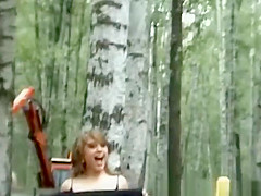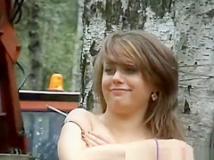 Exhibitionist brunette hair woman showing her scoops, wet crack and wazoo near some lads doing some road cleaning in the woods.