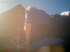 Description: Blond gal in mini costume has her white pants and booty upskirted.