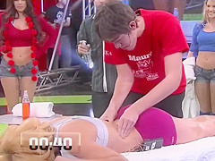 During a competition show, one of the fortunate contestants needed to properly massage a fit sex bomb with a large arse in just forty seconds.