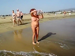 Knowing that no one will pay any particular attention, my darling went completely bare and exhibited her saggy boobs right there on the sandy beach.