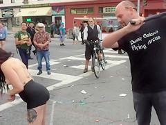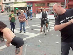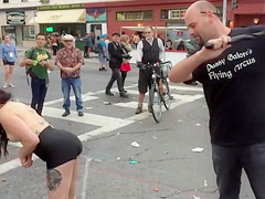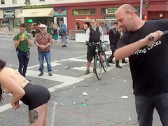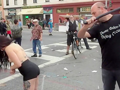 Inked topless honey suggests herself for public whipping