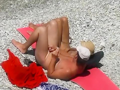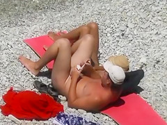 His dong is out at the beach and it’s half hard so his girlfriend happily reaches over and strokes him a little at various points in this voyeur movie scene.