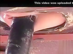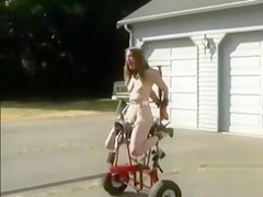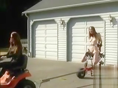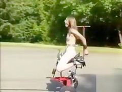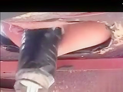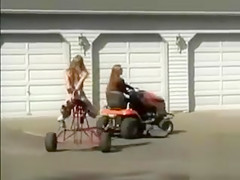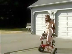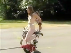 Using a vehicle to drive the permeating machine that had a slim lass fastened up to it in public a dom in sunglasses made a boss film it all with a camera.