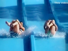 2 chicks go down the waterslide at the same time and one has her marvelous large booty stripped whilst the other has her glamorous large marangos nude as a camera captures it all.