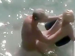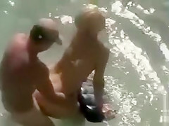 She’s bent over and resting her arms on a float as her hubby copulates her non-professional snatch from behind in the ocean and we see it all thanks to a voyeur with a camera making the spy porn.