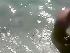 Voyeur from behind sex with pair in the ocean