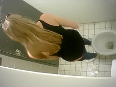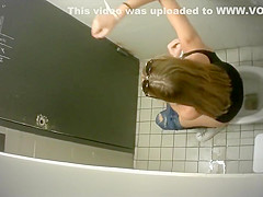 Skinny lengthy-haired brunette hair takes a quick whiz in the restroom