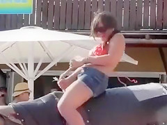 Bikini cutie rides mechanical bull outdoors
