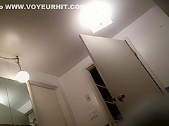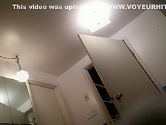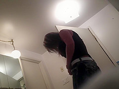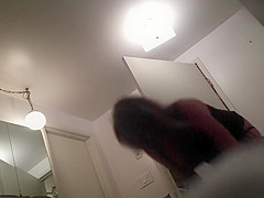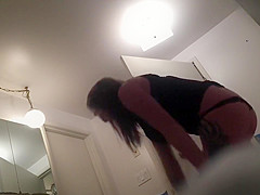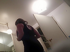 Breasty gal with a back tattoo went on to try out different outfits in front of the mirror, absolutely unaware of a hidden camera recording her from the corner.