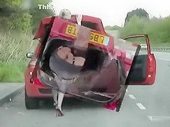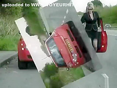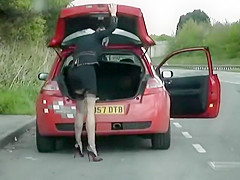 This Babe reaches into her trunk and bows over, exposing the tops of her seamed nylons and the strap that runs down the crack of her astounding arse. She’s on the side of a busy road, likewise.
