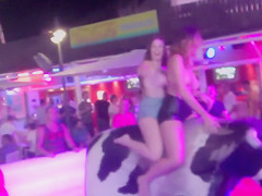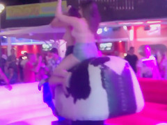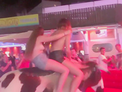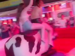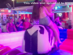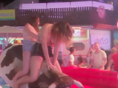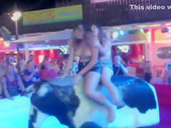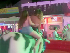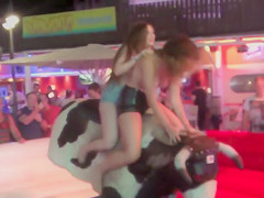 2 hot honeys jumps on an mechanical bull during the time that being topless