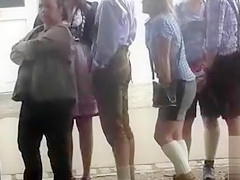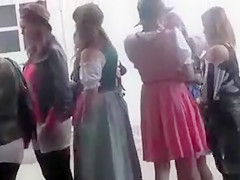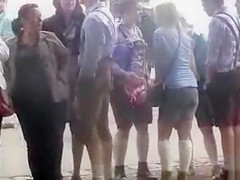 Oktoberfest cutie in water closet line has to pee badly