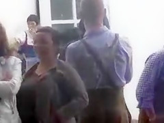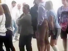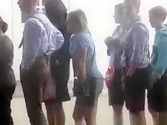 Lots of boys and cuties are in line for the throne-room, but the cute blond in the knee highs indeed has to pee badly and I loved watching her try to hold in her urine whilst awaiting to go.