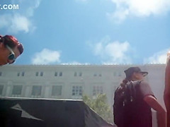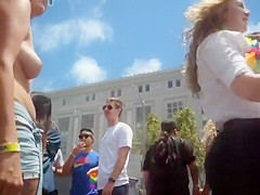Absolutely not caring about the people around her, my wicked sis removed her shirt and brassiere and took a walk showing off her merry titties in the process.