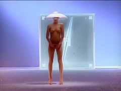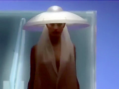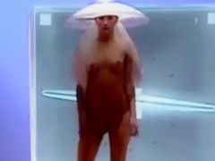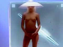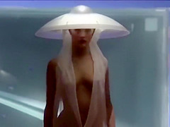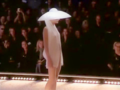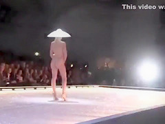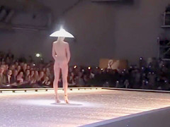 Seductive fashion model in a weird hat walks down the catwalk in the exposed