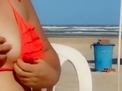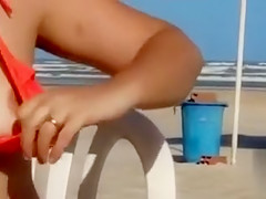 Overweight woman sets up her red bikini at the beach