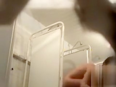 Brave peeper somehow managed to hide a camera in a public shower and caught on tape 2 sweeties with their merry milk shakes and bald cookies out in the open.